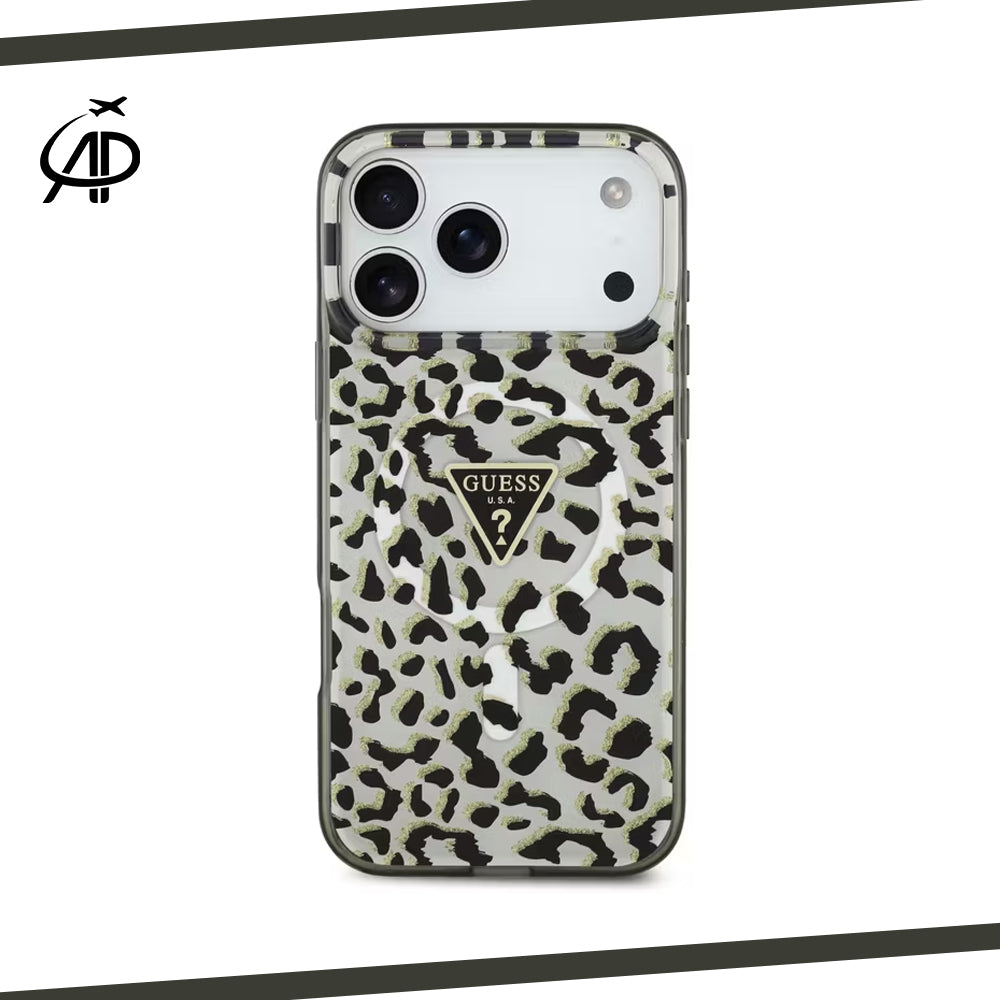 Unleash your wild side with this fiercely fashionable Guess Leopard Print phone case. The back features a striking black and white leopard pattern with subtle yellow or gold glitter accents, set on a translucent smoky gray/black background. The center showcases the iconic Guess U.S.A. triangular metal logo, signifying designer quality. The durable, slightly tinted frame provides excellent protection against bumps and scratches while maintaining a sleek profile. Designed for a modern iPhone, this case ensures a perfect fit, keeping all buttons and ports accessible. It's the perfect accessory for those who love animal print and high-fashion edge! ππ€β¨
