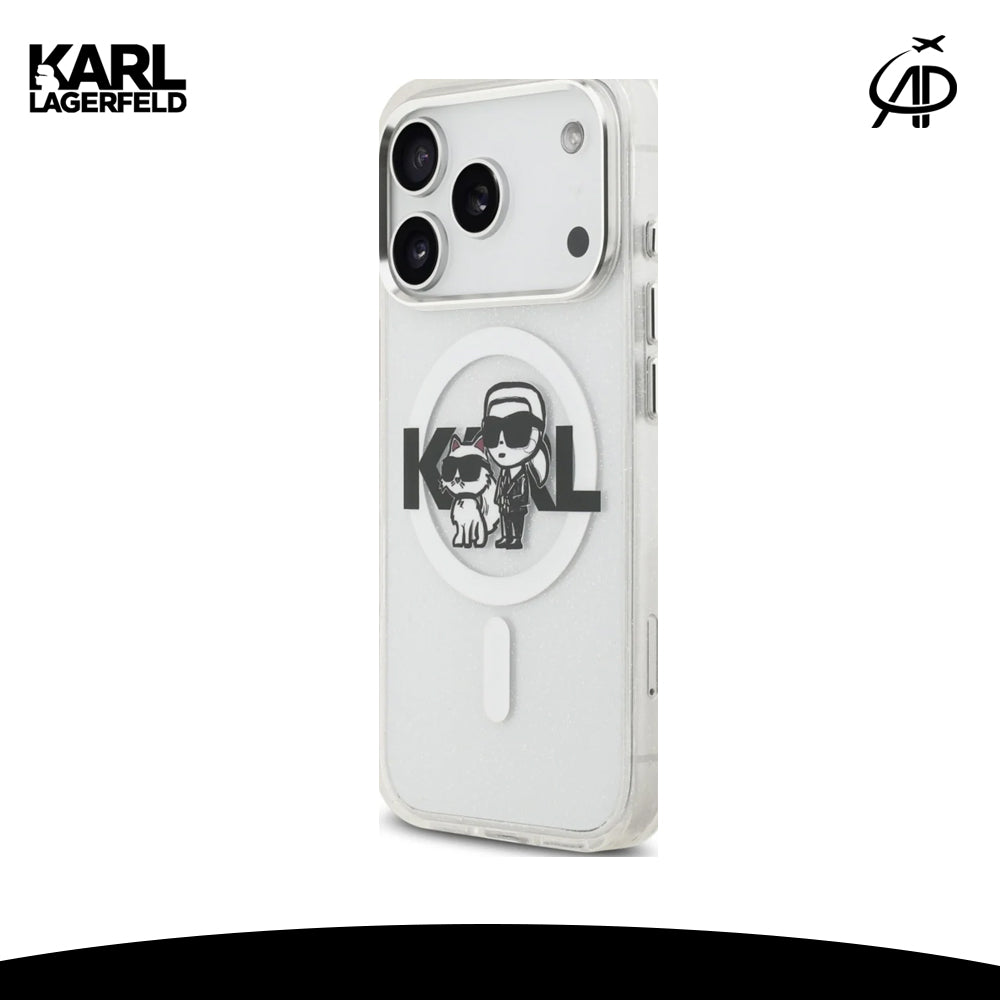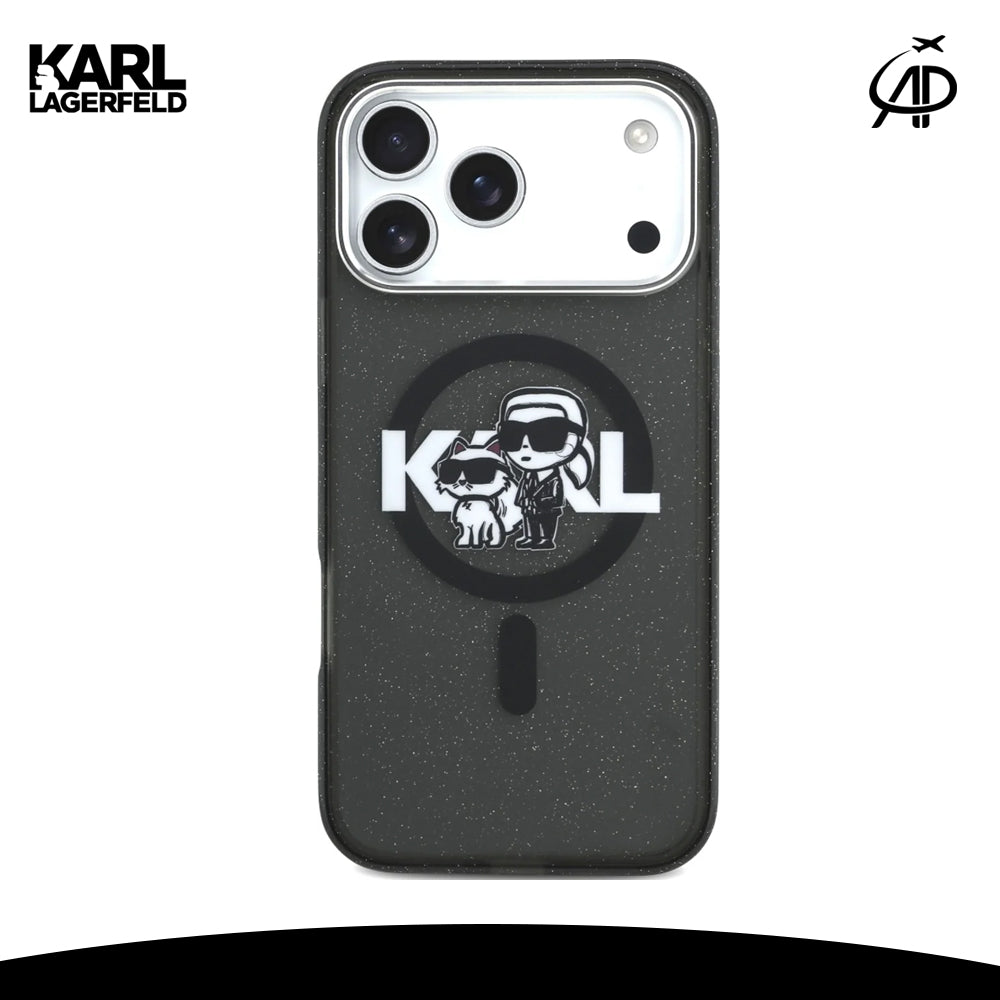 Turn heads with this dazzling and distinctive mobile phone case. The base features a sparkling, glitter-infused texture that adds a dynamic, subtle shimmer to your device. Prominently featured is a bold, high-contrast graphic of the iconic Karl and Choupette duo, capturing their unforgettable style.