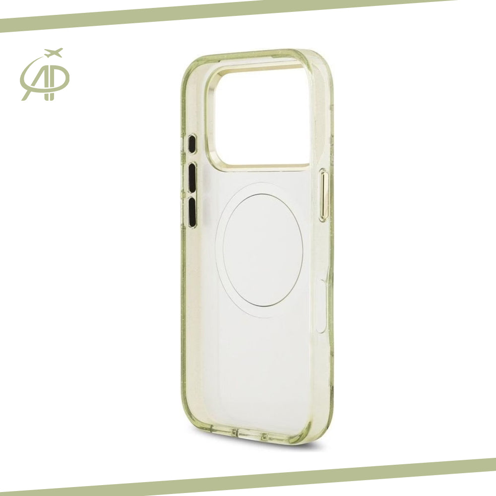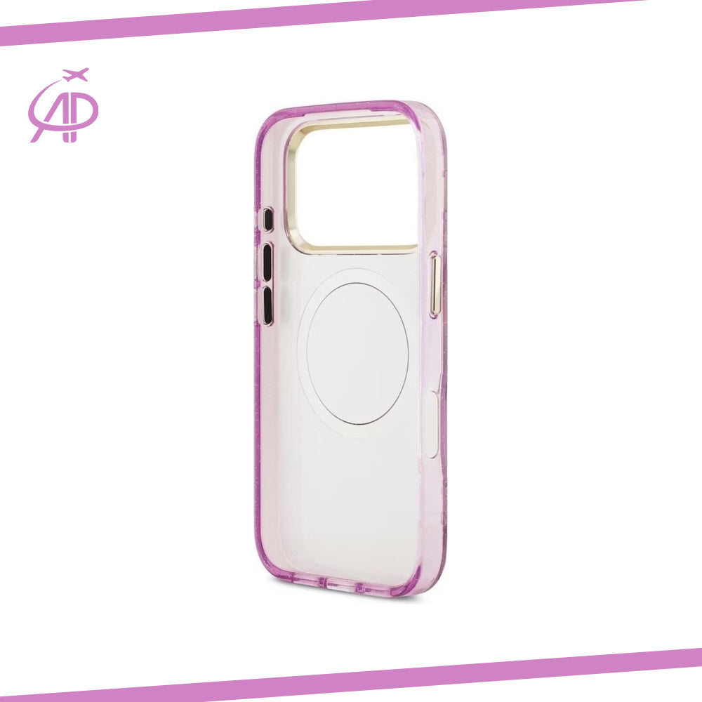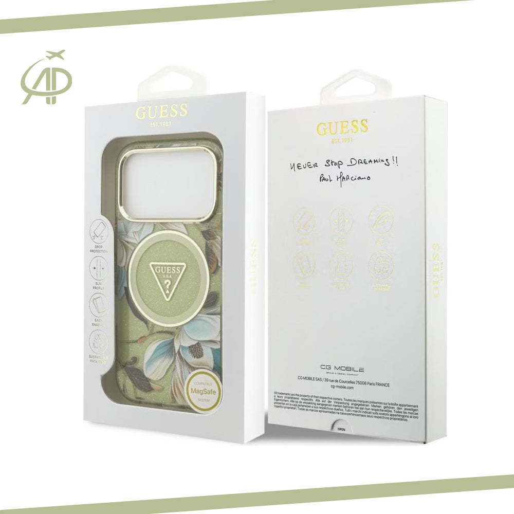 Bloom with style and confidence using this stunning Guess Floral Print Phone Case. This design combines a beautiful, artistic magnolia flower print with dazzling glitter accents for a truly glamorous look. The case is centered with the iconic Guess U.S.A. triangular logo surrounded by a prominent magnetic ring design, confirming its Magsafe compatibility for effortless wireless charging and accessory use. The durable, translucent frame offers robust protection while maintaining a sleek, lightweight profile.