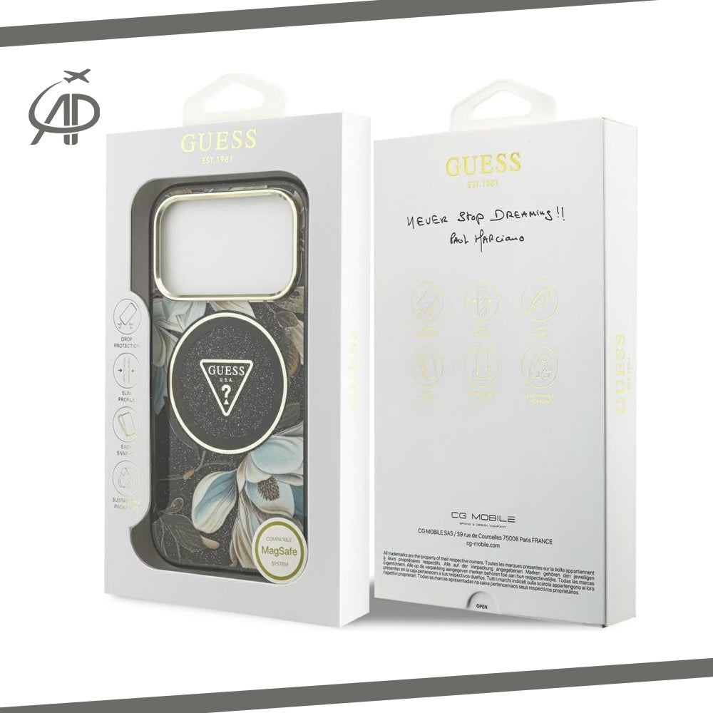 Vibrant Guess case featuring a floral print, glitter accents, and the iconic Guess U.S.A. logo. It's Magsafe-compatible for easy charging. Available in Purple , Black, and Green. Ultimate style and function! 💜⚡️👑